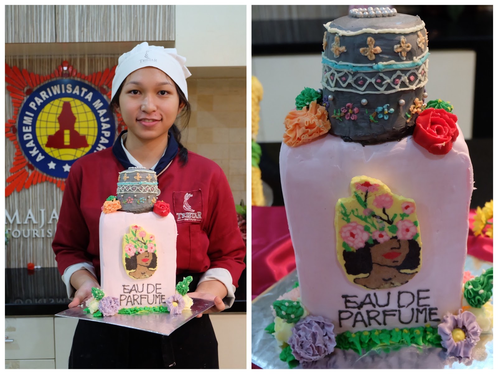 memilih botol parfum sebagai tema dekorasinya. dengan menggunakan cake dasar sponge yang mereka buat sehari sebelumnya